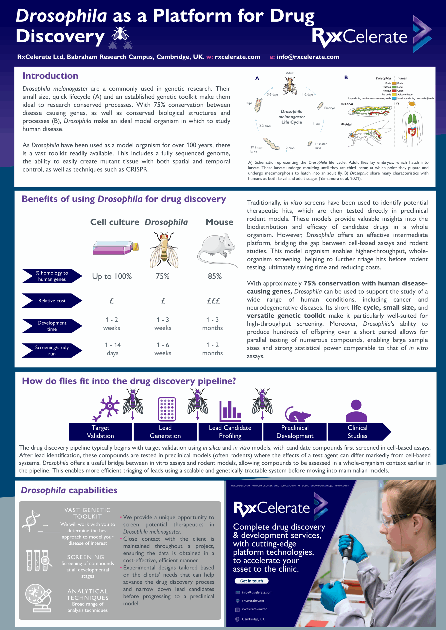 Drosophila offer a powerful, cost-effective, NC3R aligned platform for whole-organism drug screening across various human diseases. A vast array of cancers can be modelled in Drosophila (e.g. carcinoma, glioma, leukaemia) making them ideal for prioritising compounds before moving to mammalian models. Furthermore, their short life cycle, small size, and robust genetic tools enable compound screening with large sample sizes, giving you confidence your compounds are the best candidates for mammalian testing.