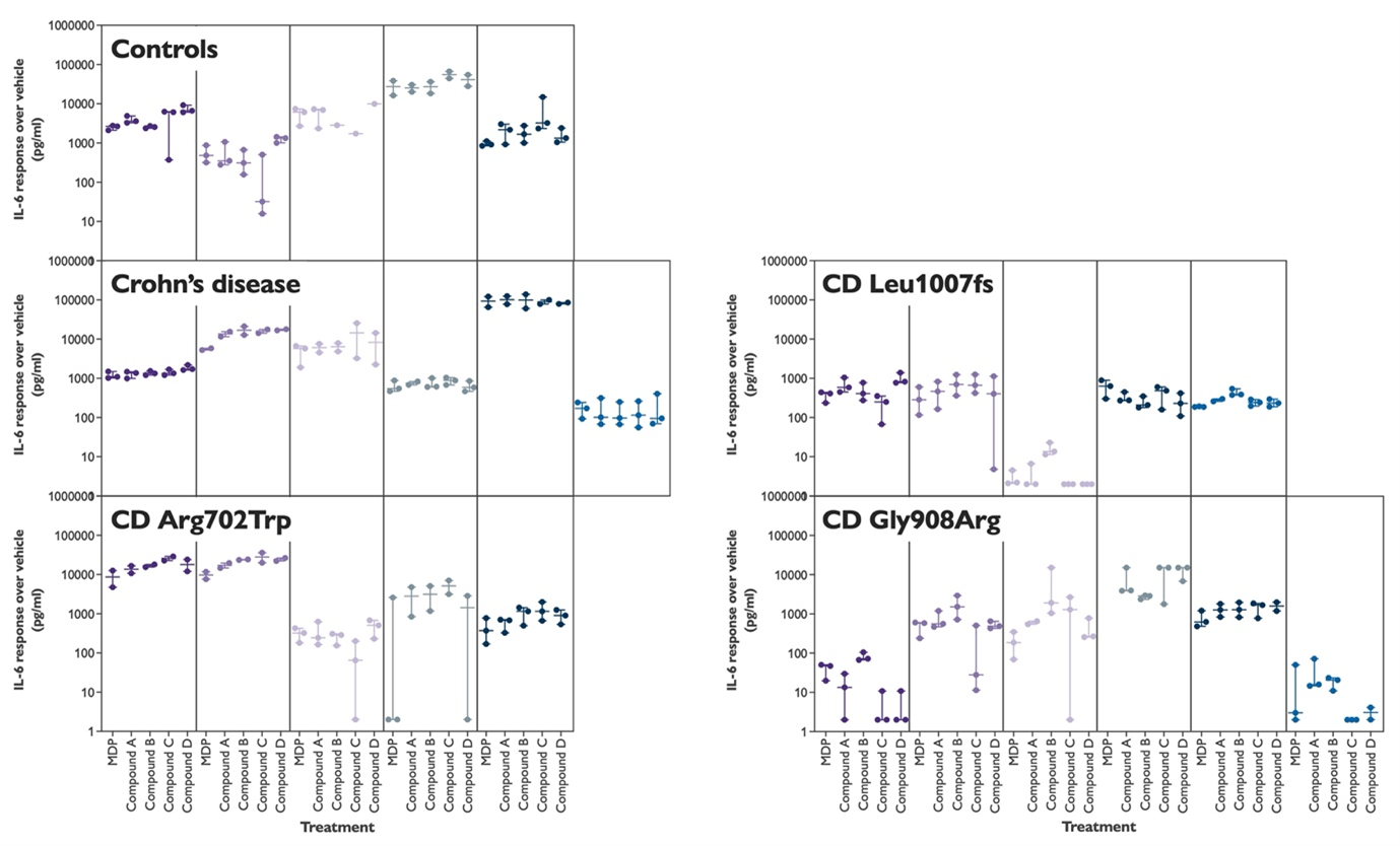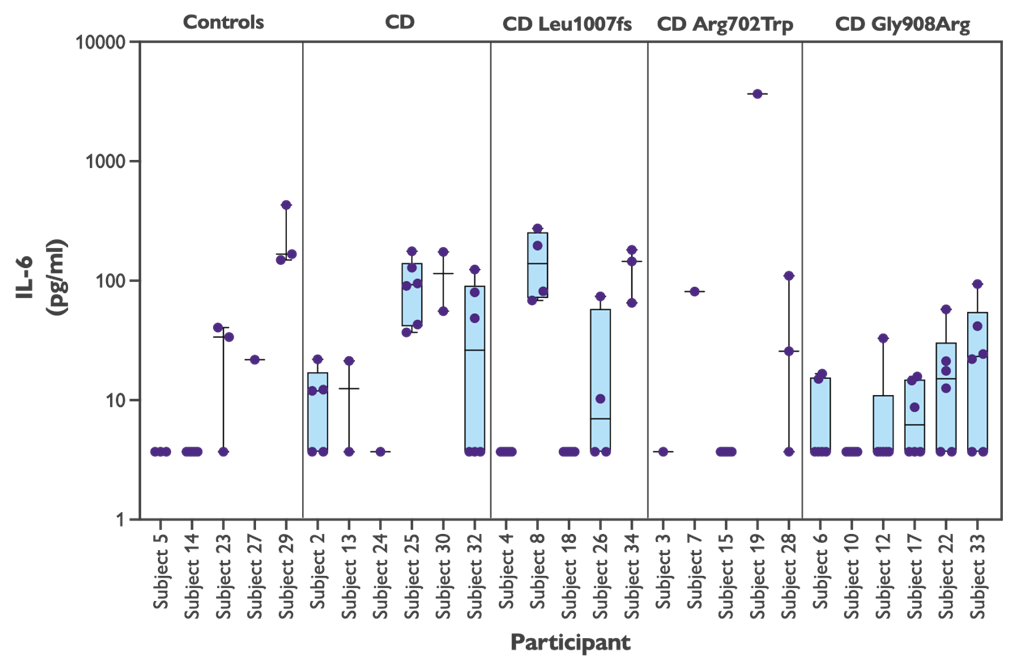There is, however, a striking person-to-person difference in the amount of IL-6 released following stimulation with NOD2 agonists.  We see differences of up to 10,000-fold between subjects. This variability is currently unexplained. Age and sex are not related to the response suggesting that maybe other genetic or environmental factors may be at play.