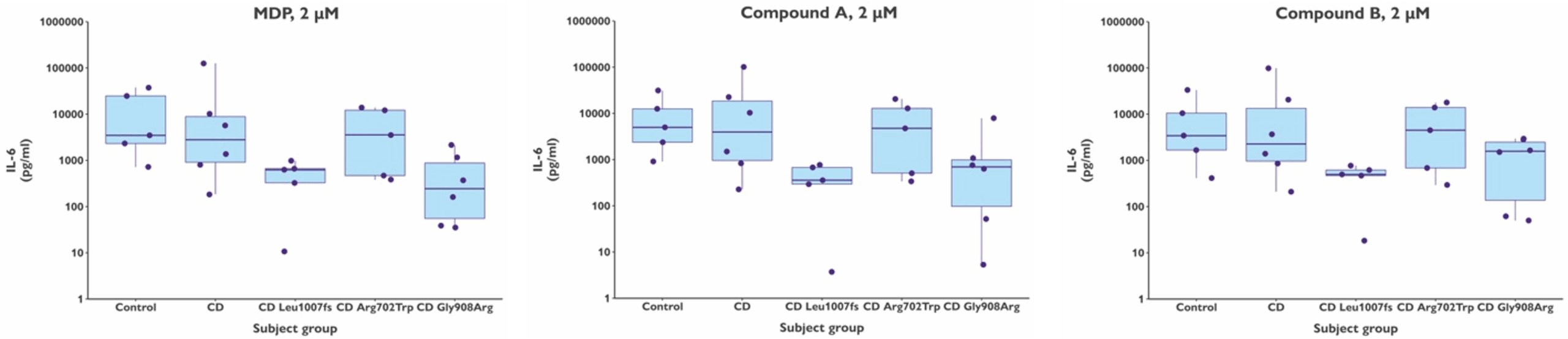 All of the NOD2 agonists tested, both the natural activator MDP and the novel Imhotex compounds, increased IL-6 production by the monocytes. There is no difference in the IL-6 response from monocytes treated with any of the agonists between control subjects and volunteers with Crohn’s disease (or CD). There are some small differences among the Crohn’s disease subjects with different genotypes, but the differences are not statistically significant.