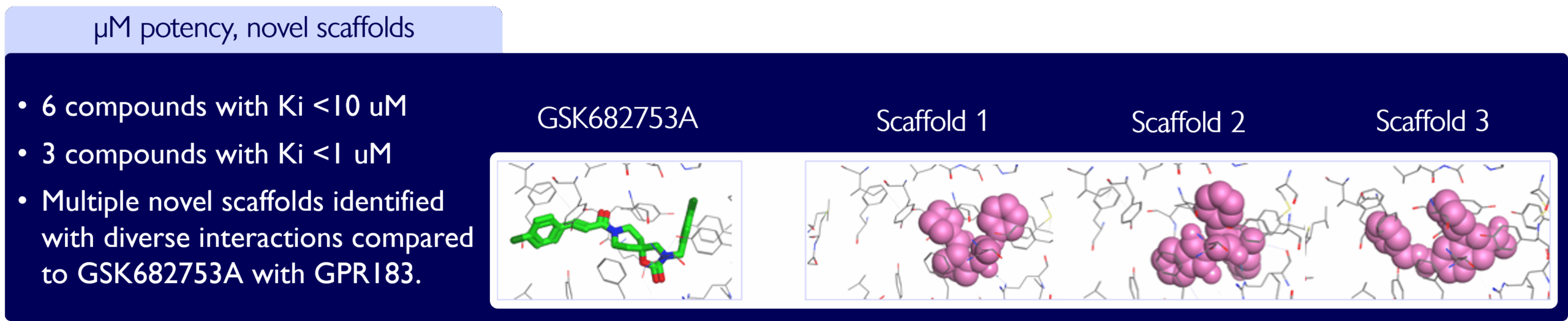 For comparison, a conventional screen of 9.1 million commercial compounds using the ProsaRx ProtoScreen approach produced a 17% hit rate, with no compounds showing sub-10 μM potency. While both approaches explored complementary chemical space, the RxNfinity™ designs were markedly more efficient, potent and importantly predicted to exhibit different receptor interactions compared to GSK682753A
