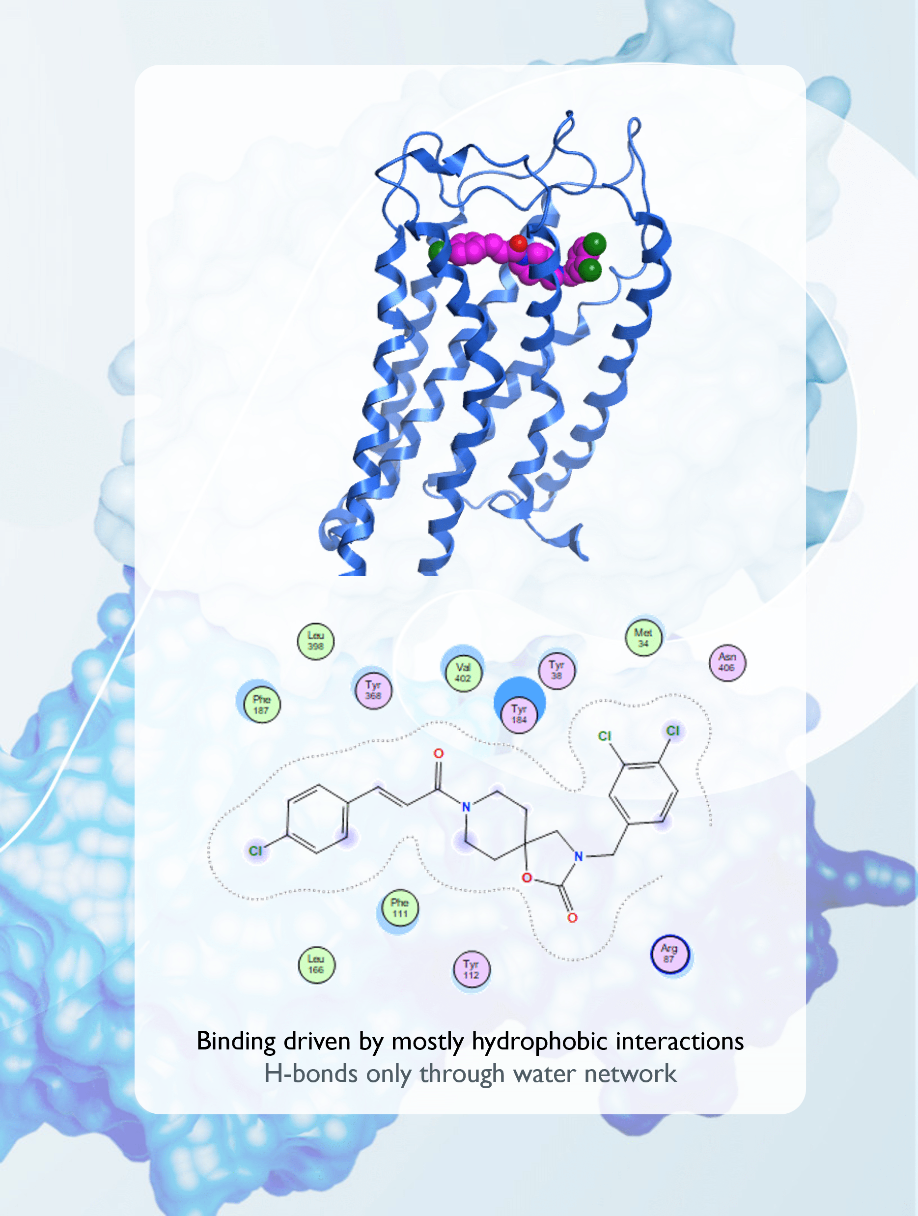 Using this structure, RxNfinity™ was deployed to explore over 1 trillion virtual compounds via retrosynthetically feasible libraries targeting the GPR183 binding site. From this, 13 compounds were selected for synthesis, 9 were made, and 7 exhibited Ki < 10 μM (3 with Ki < 1 μM) — yielding a 77% hit rate. All hits were previously unknown chemotypes with clear potential for further optimisation.